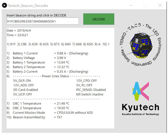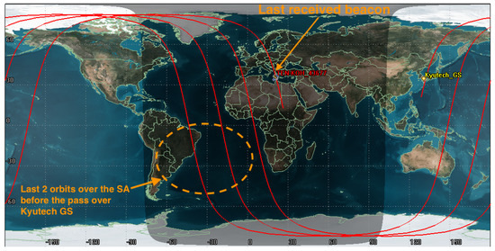 The Ten-Koh spacecraft was continuously operated daily since its launch (29 October 2018) until 19 March 2019, when a loss of communication between the spacecraft and the Kyutech ground station occurred. The ground-track of the last orbits of the satellite where the failure occurred are shown in Figure 16. The last data from its beacon were received over Greece on 18 March 2019 between 23:12:33 and 23:25:43 UTC. The decoded data indicated that all the main housekeeping parameters were inside their operating ranges, as shown in Figure 17. According to the same beacon data, the satellite was in the expected mission mode, i.e., nominal CPD mission scheduled between 22:00 on 18 March and 00:20 on 19 March UTC. The mission was supposed to finish when the satellite was coming from above the South Pole and heading northwest towards the southeast of South Africa. After finishing the CPD mission, Ten-Koh traveled for three more orbits, including two of them over the SA anomaly, before the pass over Kyutech ground station on 19 March 2019 at 13:31 JST (19 March 2019 at 04:31 UTC) when no signal was received. Irrespective of the anomaly that made the satellite fail, it occurred during the two orbits following the CPD mission and before the pass over the Kyutech ground station.