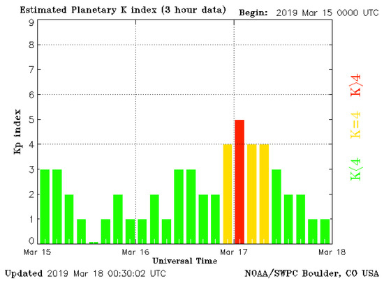 A review of the geomagnetic activity parameters from the NOAA Space Weather Prediction Center between 15 March 2019 and 18 March 2019 revealed that the Kp-index, an average of K-indices from a network of geomagnetic observatories, showed above the threshold value of 4 on 17 March 2019. As shown in Figure 18, Kp = 4 was observed between 21:00 on 16 March 2019 and 00:00 on 17 March 2019 UTC, and increased to Kp = 5 between 00:00 and 03:00 on 17 March 2019 UTC. Kp then decreased to Kp = 4 between 03:00 and 09:00 on 17 March 2019 UTC. The Kp-index with values bigger than 4 indicates a geomagnetic storm activity.
