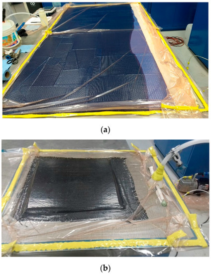 Vacuum Assisted Resin Infusion for (a) Carbon fiber reinforced plastic (CFRP) coupons and (b) example of CFRP-PVC foam core sandwich.