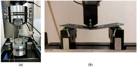 For the CFRP-PVC sandwich, flexural tests according to ASTM C393 standard [21] were performed. Nominal dimensions for the sandwich were 200 × 75 mm. The average thickness for the sandwich samples was 3.5 mm. The span length was fixed in 150 mm. For the flexural tests, an Instron 8872 Servohydraulic Testing Machine (CENTA, Queretaro, Mexico) was employed. The crosshead rate was set to 6mm/min until the coupon failure is reached (Figure 2b).