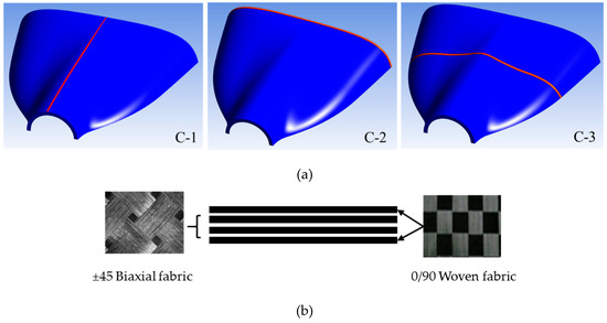 The CFD model for the resin flow through the cowling fibers preform is based on the solution of the porous media equations in ANSYS Fluent. The Volume-of-Fluid (VOF) technique was implemented in order to solve the equations for a two-phase flow (air-resin) including the interface and to track the advance of the resin front as a function of time [25]. An unstructured tetrahedral mesh was built to discretize the conservation equations. The time step was adjusted throughout the simulation in order to obtain a Courant number less than 1 during the entire simulation. The boundary conditions implemented in the model were based on the vacuum pressure that the company has fixed for its VARI processes. The geometry of the aircraft upper cowling is shown in Figure 3a. Three different configurations for the inlet and outlet gates were simulated, C-1, C-2 and C-3. The inlet gate for each case is plotted in red color in Figure 3a, the resin outlet was simulated in the lateral edges of the cowling. The laminate code for manufacturing the upper cowling is shown in Figure 3b.