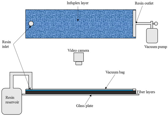 The mold and preform preparation proceeded as follows. First, the glass plate was treated with mold cleaning (acetone) and release agents (demolding wax). Next, carbon fiber fabrics were cut to 0.1 × 0.9 m2 and laid up on the glass. An infuplex layer (high permeability layer, HPL) was placed on top of the carbon fiber fabrics in order to promote a uniform resin flow along the laminate. Afterwards, a point injection source and a linear sink were placed on the glass plate in such a manner that the resin would flow along the longest preform dimension. After the vacuum bag was placed and sealed, the linear sink and the injection source were connected to the vacuum pump and resin reservoir, respectively. Finally, a digital video camera was mounted above the glass plate to monitor the flow front progression with time. The vacuum pump maintained a pressure of 3.07 kPa throughout the resin transfer process. The results obtained are shown in the following section.