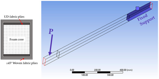 The performance of the aileron main beam was evaluated in cantilever conditions and the results were compared with the ones predicted by a Finite Element Method (FEM) simulation (CENTA, Queretaro, Mexico). The experimental test consisted of a fixed cantilever beam and an applied localized load, P, which was increased until the beam failed. The FEM simulation was implemented using ANSYS ACP utilizing the mechanical properties obtained from the level 1 tests. A total mesh of 8640 elements was constructed for the fiber-core assembly. Shell type elements were used for fiber layers and Solid type elements for the PVC foam core.
