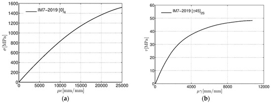 Tensile stress-strain curves for IM7-2019 composite (a) unidirectional (UD) [0]4 and (b) [±45]2S.