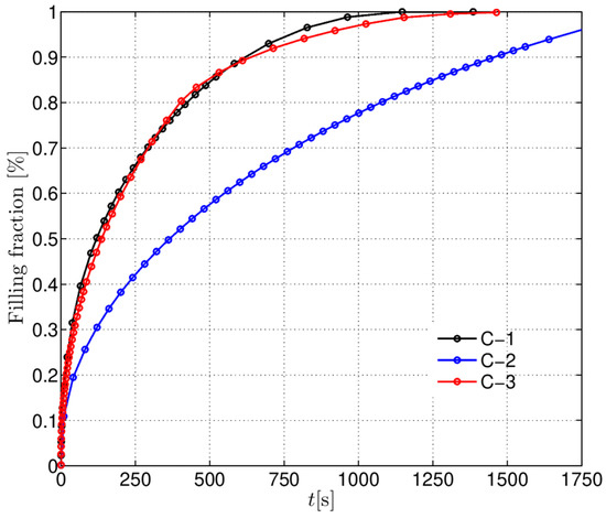 Once the permeability of each ply of the laminate was determined, the average effective permeability and porosity were calculated for being included as an input parameter of the CFD model. The effective permeability resulting from the experiments for the cowling laminate was keff = 3.8641 × 10−12. The details with respect to the permeability calculation from the experiments for each ply of the laminate can be found in Reference [26]. Fiber volume fraction tests were performed for each ply of the laminate in order to compute the porosity. The effective porosity of the laminate was calculated as the average porosity weighted with the thickness of each ply, resulting equal to ϕeff = 0.479. The filling process simulation were carried out for the three configurations C-1, C-2 and C-3, presented in Figure 3. In order to analyze quantitatively the filling process of the component, the integral of the resin volume fraction as function of time was computed during the simulations and is plotted in Figure 9 for the three configurations. The curves of the resin volume fraction can give relevant information about the evolution of the impregnation process. As can be observed, with the C-1 configuration the cowling fills faster than with the others. The filling process with C-2 configuration lasts much more time that the C-1 and C-2 and after 1750 s in the simulation, the cowling was not completely filled of resin. On the other hand, the resin volume fraction as a function of time behaves in a very similar way to the beginning of the process for C-1 and C-3 configurations, however, in the final part of the process, the resin impregnation of the preform slows down in C-3 with regarding C-1. From this information, the C-1 configuration can be considered the best choice in order to minimize the filling time. For this configuration, the resin flows and fills around 40% of the component very quickly until the flow considerably slows down due to the pressure balance inside the porous medium.