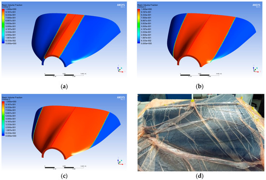 Results from the computational simulation of the resin impregnation process for the upper cowling using C-1 configuration: (a) t = 21 s; (b) t = 250 s; (c) t = 500 s and (d) resin infusion of cowling.