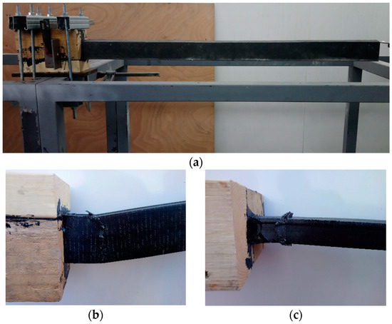 Mechanical test of the aileron main beam: (a) experimental set up; (b) front view and (c) top view of the beam failure.