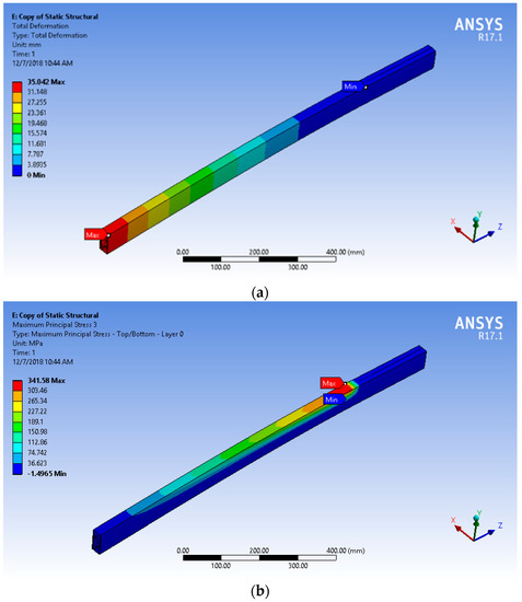 Finite Element Method (FEM) simulation results of the aileron beam in cantilever: (a) Total deformation; (b) Maximum principal stresses σ1.