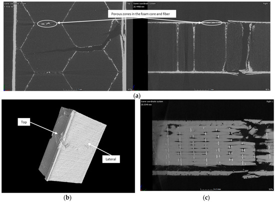 In order to visualize in detail the internal structure of the beam and capture the manufacturing miscues, a computerized tomography analysis (CT-Scan) was carried out. In Figure 14b, the results from the three-dimensional reconstruction of the beam using the CT-Scan equipment are shown. A lateral and top slices at the middle planes of the beam structure are presented in Figure 14a. It can be seen the hexagonal PVC foam core on the left and the top and bottom fiber layers on the right side. The presence of pores is easily identified in the fibers and the hexagonal PVC foam core, the lack of resin in those zones can promote the premature failure of the beam with respect to the results obtained from the FEM simulation. In Figure 14c, a top slice at one of the UD fiber layer is shown, the pores and the fracture path in this fiber layer can be observed.