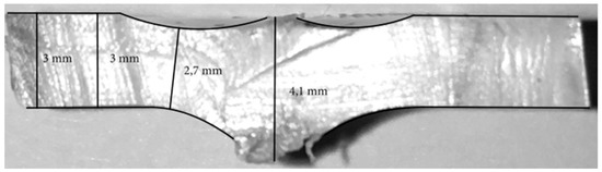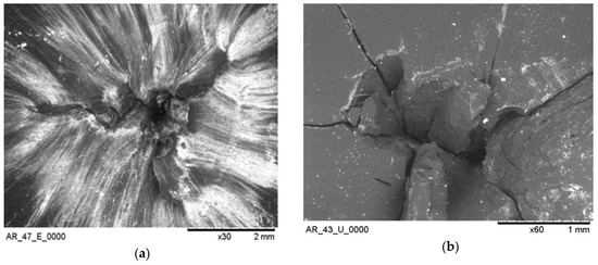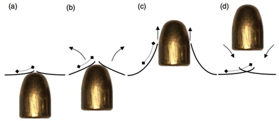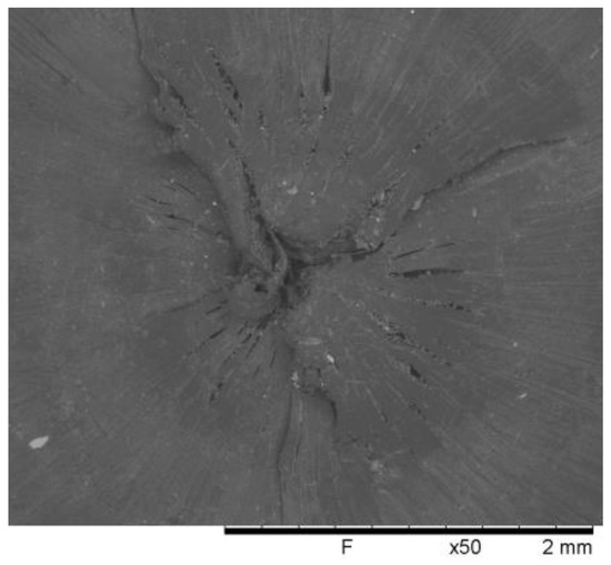 Figure 8b,c, show the difference of bullet passage through ionomer panels in the two situations, i.e., with and without lubricant. In both images, two different circular areas can be distinguished; an internal area, where the material melted, which is much smaller than the bullet diameter and an outer area where most of the viscoelastic deformation occurred with no phase change. It is in the outer area where the main differences can be noticed; the absence of the striations suggests that the lubricant, with its slippery effect, allows the bullet to pass through the ionomer with lower material stretching (low plastic deformation). This observation may be linked to a rapid viscoelastic return and a lower drop of the temperature in the melted area; the consequence of which seems to be improved healing. This was confirmed by the tensile tests carried out after the shot tests; the samples on which the lubricant was applied showed no failure in the perforated area, while in all the other cases the failure started from this area. On this basis, considering that melting occurs in any case, the friction energy seems to represent a significant but not critical contribution to the total melting energy, whose main origin is thus attributed to the strain energy.