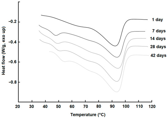Ti, between 40 °C and 60 °C and the corresponding heat transfer; the peak, which may be related to the ionic presence, becomes more defined and shifted to higher temperatures with the increasing aging time. According to the tests performed, the secondary transition cannot be detected for a sample aged 1 day which might be due to the low size of the ordered microstructure formations for this aging time, see