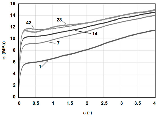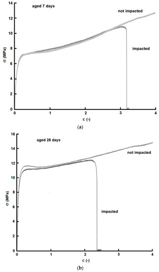 Figure 7 reports, as examples, the stress–strain curves recorded in impacted and not impacted specimens after 7 and 28 aging days.