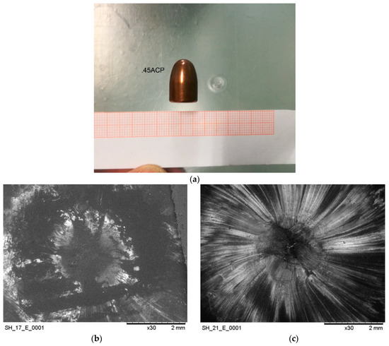 The tests at medium velocities (280 m/s–450 m/s) were carried out at the TSN-National Shooting Range in Milan and at the Ballistic Laboratory of the Italian bullet manufacturing company, Fiocchi Munizioni SpA, Lecco, Italy. In this case, the bullets were 9X21 and .45ACP calibers, shot by a Kimber Custom II handgun and a Beretta CX4-Storm Carabine. 9X21 and .45ACP bullets have a rounded impact nose with a diameter of 9.5 mm and 11.5 mm, respectively. The speed was measured by a laser chronograph. For the temperature-controlled tests, the ionomeric panels were kept in thermostatic chambers at temperatures between −40 °C and +70 °C before shooting; the actual temperature at the moment of shooting was checked by a non-contact infrared thermometer.