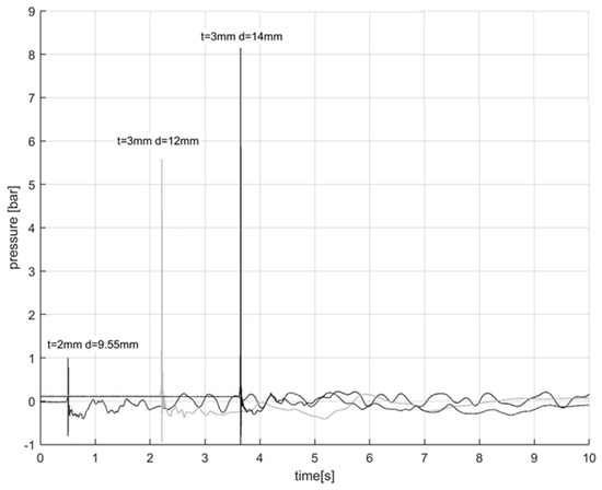 In all tests with a water-filled tank, pressure variations were recorded during the entire impact event by sensors placed near the impacted wall (P1) and near the opposite wall (P2); sensors placed in other locations did not provide clear results. As a general trend, it was observed that the bigger the impacting sphere, the higher the pressure peaks. This is expected both considering the larger volume of the projectile entering the tank and the higher deflection of the panel due to the impact energy.