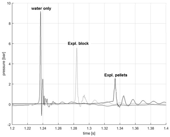 Figure 15, with pellets leading to a more efficient pressure peak reduction. In the case of a pressurized tank, a similar trend was observed, again with a more efficient peak reduction effect given by filler in pellets form. It was noticed that during impacts, the internal overpressure was maintained and, only when a small hole remained unsealed after impact, a slow reduction of pressure was recorded afterword.