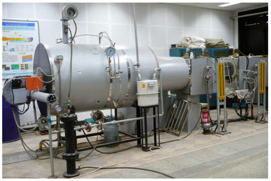 Figure 2 shows the schematic representation of the test rig. The hot main gas system includes a fuel injection section and a burner section and produces hot gas with a temperature of 800 °C. The fuel is mixed with air and is ignited in a 380 Mcal/h burner. The fuel is liquefied petroleum gas (LPG) and has a flow rate from 15 to 30 kg/h, regulating the burner output power at a range of 200 to 400 Mcal/h. The combustion products leave the burner with a temperature of ~2000 °C and enter the diluting section. The hot gas is mixed with the diluting air and the sprayed water, supplied by the top blower and the water supply system, respectively. The resulting hot multicomposition gas is 800 °C.