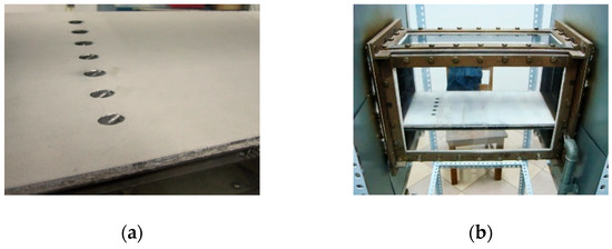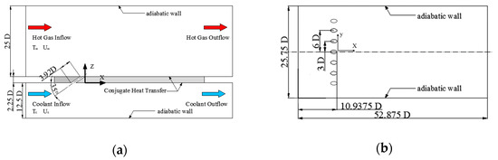 Schematic drawing of the test section. (a) Front view of the test section; (b) Top view of the film-cooled plate.
