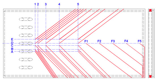 The measuring system includes the pitot tubes, the static pressure tubes, the thermocouples, and the chromatographic analyzer. Four thermocouples are implemented at the center point of inlet and outlet of mainstream channel and coolant channel, measuring the temperatures of the inflow and the outflow, as shown in Figure 2. The inflow velocity is obtained by two pitot tubes that are installed in the center of each channel at the inlet of the test section. The back pressures of the channels are acquired by the static pressure tubes located at the outlet of the test section. In the downstream area of the centered film cooling hole, 90 thermocouples are installed on the top surface, bottom surface, and the middle of the plate, as shown in Figure 5 and Table 1. The gas collecting tube locates at the stabilizing section of the hot main gas channel. The composition of the hot gas is determined by the chromatographic analyzer from the gas sample collected.