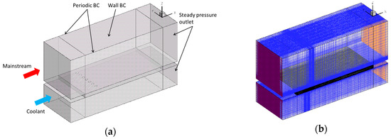 The computational geometry is similar to the test section, including hole geometries, coolant, and mainstream supply system. The inlet and outlet sections are extended by 10 D to generate stable flow boundary conditions as shown in Figure 6. Figure 7 shows the multiblock structured mesh, which is refined near the film-cooling holes and near-wall regions. More than 10 points are implemented in the boundary layer to achieve y+ less than unity. The total element amount of the mesh is ~7.94 million. A grid refinement was conducted to generate a mesh with 12.20 million cells and check mesh independent study. The results show that the two sets of meshes behave quite similar, and hence the mesh with 7.94 million cells is adopted in the present simulations.