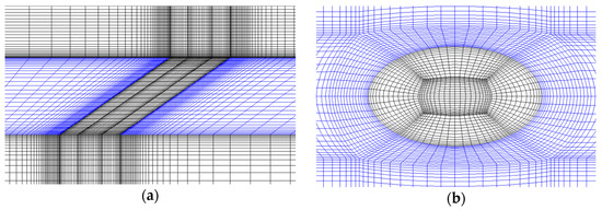 Details of the structured mesh. (a) Refined mesh near the plate and (b) refined mesh around the film cooling hole.