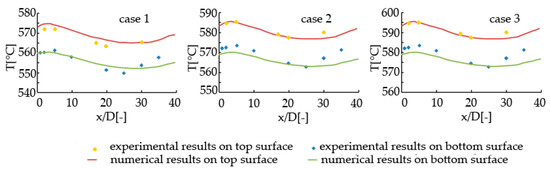 Figure 8 shows the experimental and numerical centerline temperature distribution along the centerline on the top and bottom plate surfaces. The red line indicates temperature distribution on the top surface, and the green line indicates the temperature distribution on the bottom surface. It is shown that the numerical results agree well with the experimental results for three cases. Therefore, it is concluded that the DTM and WSGG model are adequately accurate for the present cases.