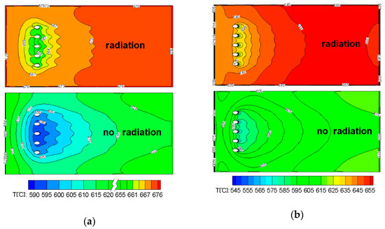 Temperature distribution with/without radiation (a) on the top surface and (b) on the bottom surface.