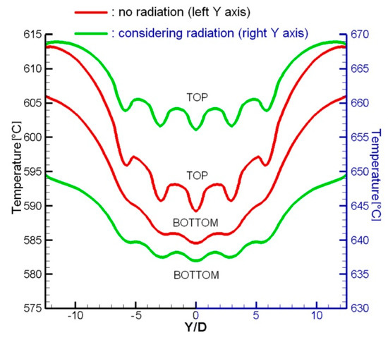 Continually, the spanwise temperature profiles on the top plate surface at x/D = 1 in both cases are shown in Figure 10. It is noted that, on both top and bottom surfaces near the film cooling hole, the temperature profile in the spanwise direction becomes smoother when considering the radiation. This means radiation decreases the temperature gradient in the spanwise direction.