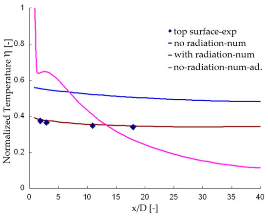 Figure 11 shows line plots of η along the centerline of the plate top surface, an adiabatic case is employed as the basic. Compares with the case with no radiation, the normalized temperature of the case with radiation is ~0.2 lower, and even is lower than the adiabatic effectiveness before x = 13 D, the high cooling effectiveness near the holes almost disappears. That is to say, the film cooling effect is weakened by radiation while it further smears out the temperature gradient. In real engine conditions, the hot main gas temperature will be higher than 1200 °C (much higher than the condition of the test rig), leading to high surface temperature and a high local temperature gradient, which will result in significant thermal-mechanical load. The radiation enhances the increase in temperature but weakens the temperature gradient.