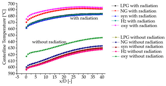 Figure 12 shows the temperature distribution along the centerline of the top surface for five different fuels, with and without considering the radiation. Without considering radiative heat transfer, the temperature distributions are similar for five different fuel cases. Nitrogen is the major composition of the hot gases and its mole fraction is more than 70%, while steam is the major composition of the combustion product of oxy and its mole fraction is 82%. Therefore, it is observed that the temperature distribution for the combustion product of oxy is ~15 °C higher than the other four gases. When considering the radiative heat transfer, a temperature increase of ~50 °C is observed. A great temperature rise occurs for the combustion product of the natural gas, which leads to a quite close temperature distribution to that of the combustion product of the oxy-fuel gas.