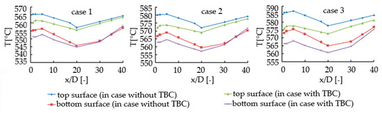Therefore, we conclude that the heat insulation effect of TBC grows more obvious when the radiation effect is significant. This is caused by the radiation property differences between TBC and the nickel-based alloy. However, when TBC is coated, over 50% of the radiation heat transfer is reflected by TBC, which means TBC absorbs less radiation heat than superalloy and protects the metal substrate. Another advantage of TBC is that it smooths the temperature distribution and decreases the temperature gradient to some extent [33].