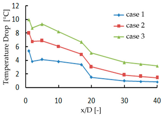 The temperature drops inside TBC are shown in Figure 14, which is derived from the results of three pairs of cases. It is clear that, in case 3, a higher percentage of steam results in a greater temperature drop. By observing the temperature drop distribution with x/D, it is observed that the temperature drop reaches maximum value at the entrance section and decrease as x/D increases. This is associated with the radiation distribution feature, i.e., a larger humidity causes a stronger radiation. Therefore, the radiation is strongest at the entrance section, and grows weaker as x/D increases, which indicates the temperature drop by TBC is higher when radiation effect is stronger.