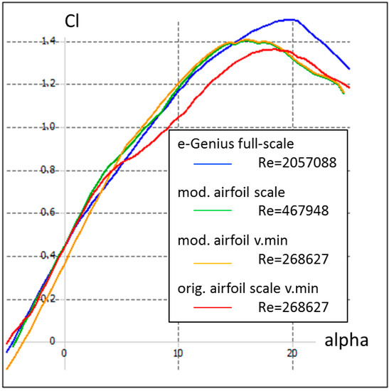 The required lift coefficients calculated using the lift equation are being compared with those from the polar curves to verify the ability of holding altitude at the scaled minimum velocity using the modified airfoil. Although the required lift cannot be created, the polar curves of the modified airfoil align much better to those of the full scale aircraft compared to the original one. The occurring error in the achieved landing velocity is 19% [11].