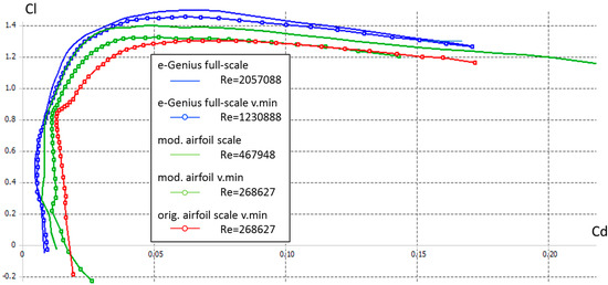 As opposed to the geometric scale of the full-scale aircraft, the airfoil of the main wing cannot be scaled geometrically without influencing the flight characteristics as the Reynolds number cannot be met. To ensure the model airplane to have the same flight properties, the fundamental dimensionless quantities of the main wing should not have too large of deviations [12]. Otherwise flight performance tests of the model cannot deliver valid results for investigating scaling laws as a technical basis comparing the full-scale and the scale model of the e-Genius and other airplanes.