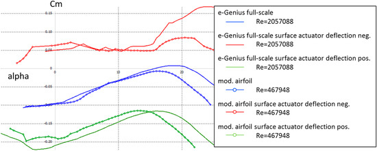 The curve progression of the moment coefficient at different states of surface actuators deflection is examined to ensure the maneuverability (Figure 5) of the scaled aircraft. All in all the responses in all flight conditions are nearly identical, only at very high angles of attack and low speed the effects of the surface actuators are apparently smaller.