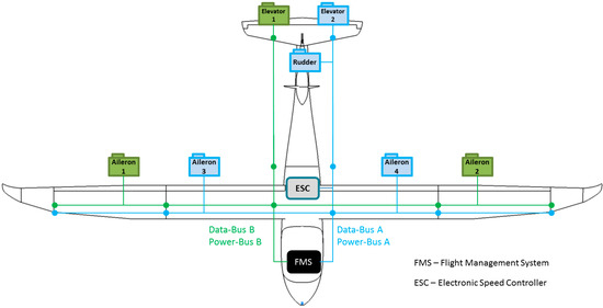 For fail safe reasons each segment of e-Genius-Mod (Figure 10) is connected with two buses of the flight management system to ensure redundancy. E-Genius-Mod has two separate data buses and two power buses. The power buses are realized with a Powerbox-System which is connected to two batteries for a redundant power supply. As a result, no single failure in the power supply system leads to a loss of the aircraft.