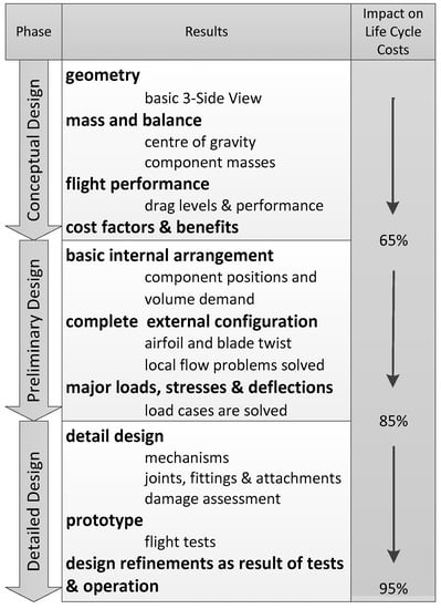 Three phase design process applied to rotorcraft proposed by Raymer [] and Nicolai [] and the corresponding impact on life cycle costs according to Roskam [].