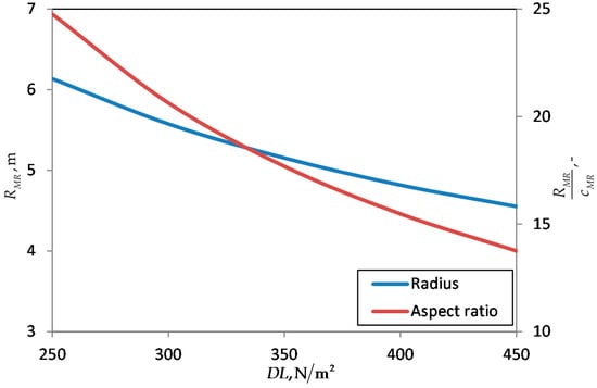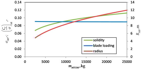 The thrust corresponds to hover with . The graphs show rotor radius as well as solidity increasing with . The resulting blade loading is slightly decreasing from 0.091 to 0.09 within reasonable values. In addition to Equations (8) and (9), the Equations (10) and (11) define the radius and solidity of a tail rotor.