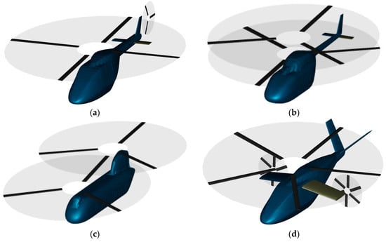 Four examples for external configurations: (a) the standard configuration with one main rotor and a lengthened front for retractable landing gear and a higher amount of avionics; (b) the coaxial configuration with a fuselage loft for the installation of landing skids; (c) the tandem configuration with long cabin part and tail cap; (d) compound configuration including wings, propellers, a V-tail and a long rear part.