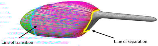 Streamlines on the surface of conventional fuselage model including transition forecast. The streamlines end on the separation line.