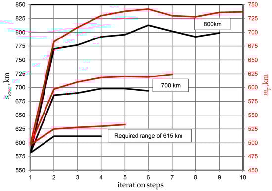 Experience shows a good relation between the maximum take-off mass and the basic empty mass. The specific mission mass and the fuel mass form the useable mass. The true problem for initialization is that mission scenarios for rotorcraft are much more specific for each design than for fixed-wing. It is obvious from Equation (1) that different ratios of specific mission mass and fuel mass are possible for one maximum take-off mass. This is the fundamental reason for iterative computations in a sizing loop. In order to start such a loop an initial configuration has to be derived. The estimation of and by Equations (3) and (4) is one possibility, considering an increasing amount of equipment in Equation (2) for configurations resulting in more than 5 tons of .