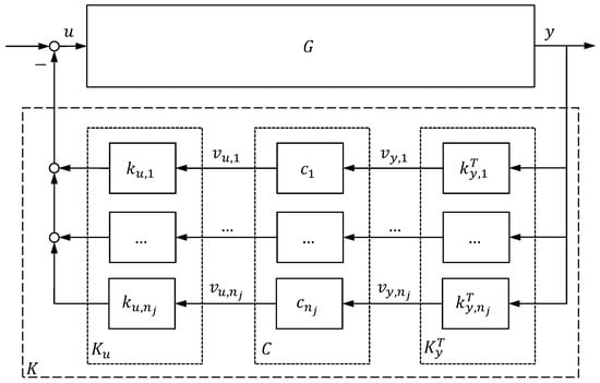In Figure 2, the resulting feedback interconnection is depicted, where the modes are subject to be controlled. Summarizing the input and output blending vectors in and , the overall controller is