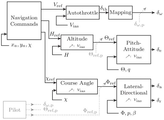 The inner loops of the control system in roll, pitch and yaw provide the basis for the operational model (ii) and (iii). Mode (iii) is the core element of the autopilot adding the outer loops for course angle, altitude and speed control (autothrottle) as illustrated in Figure 4. Thus, a series of cascaded control loops is used to facilitate the control design task. As the cross-coupling between longitudinal and lateral axis is negligible, longitudinal and lateral control design is separated. Thrust commands which are transferred to an engine revolution command via a nonlinear mapping and the elevator are the available actuators for longitudinal control. The available bandwidths for throttle and elevator differ considerably such that a combined control design does not promise any advantages. Thus, the reference for the indicated airspeed is controlled solely by the use of the throttle command . The elevator command is used to control the attitude in the inner loop and the vertical position of the aircraft in the outer loop. The pitch-attitude controller in the most inner feedback loop tracks the pitch-attitude (), attenuates wind disturbances, and improves short period damping with the pitch rate (q) measurement as an auxiliary feedback signal. The cascaded outer loop establishes control of the altitude (H). Both controllers are scheduled with velocity (), indicated by ↗ in Figure 4, to achieve optimal performance over the required velocity range.