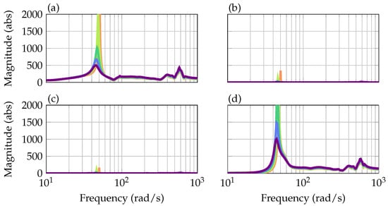 Bode-magnitude plots from virtual inputs to virtual outputs illustrating the decoupling of the unstable symmetric bending mode (a) from the unstable asymmetric bending mode (d) via the negligible contributions in the cross-coupling channels depicted in (b,c). The plots are shown for 52 m/s (