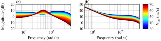 The control loops use scheduled elements of proportional-integral-derivative (PID) controller structures with additional roll-offs in the inner loops to ensure that no aeroelastic mode is excited by the baseline controller. Scheduling with indicated airspeed is used to ensure an adequate performance over the velocity range from 32 m/s to 70 m/s. For the scheduling a first or second order polynomial in following Equation (16) is applied. As an example, the proportional gain depends quadratically on with the free parameters , , and . These free parameters are directly included in the optimization problem (15). A comprehensive summary of the used controller structures for each cascaded loop is provided in Table 1, including the channel description in the controller architecture and the implemented scheduling.