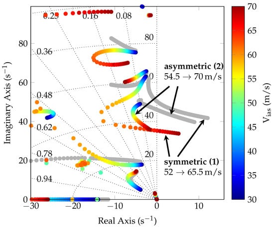 Closing the two SISO loops stabilizes the two flutter modes as it is illustrated in the pole migration plot in Figure 8. The plot compares the closed loop poles of the aircraft with the baseline controller depicted in gray to the closed-loop poles of the aircraft with baseline and flutter controller depicted in color in dependence of the airspeed. Clearly visible is the unstable behavior, i.e., the crossing to the right half plain of the first (symmetric) and second (asymmetric) flutter mode in the open-loop. With the flutter suppression controller the symmetric flutter mode is stabilized up to airspeeds of 65.5 m/s. The asymmetric mode is stabilized even beyond 70 m/s. Demanding additional single-loop robustness margins of 6 dB in gain and 45 in phase to the critical point, leads to a maximum operational speed of about 60 m/s. This still results in an increase in allowable speed of more than 15 % compared to the case without active flutter suppression. Also noticeable is that the other poles of the system(s) are not largely affected by the flutter suppression controller. This is acceptable since damping is increased rather than decreased.
