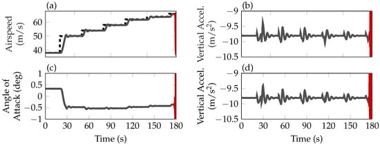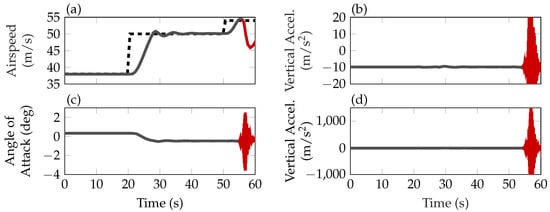 Figure 9 depicts the aircraft speed in the diagram (a), the vertical accelerations on the wing root of the left wing in diagram (b), the aircraft’s angle of attack in diagram (c), and the vertical accelerations on the left wing tip in diagram (d). The first step in the reference airspeed happens at 20 s simulation time. The aircraft accelerates, leading to a reduction of the required angle of attack (c) to hold the altitude, and reaches the commanded speed of 50 m/s. At 50 s simulation time the reference speed is increased by 4 m/s. The aircraft reaches the flutter speed and the wings start to oscillate, indicated in red (