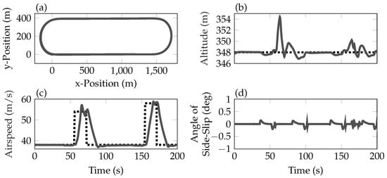 ). The pattern is flown with a nominal speed of 38 m/s. On the test leg the speed is increased to 54 m/s in the first lap and 58 m/s in the second lap. The altitude is maintained by the control system at 348 m shown in diagram (b). The visible spikes at about 65 s and 160 s in the altitude and airspeed are due to vertical wind gusts simulated on the test leg to verify the control system’s robustness against disturbances. The control system maintains the angle of side-slip around zero during the whole flight including the turn maneuvers. Thus, the baseline controller is able to adequately track the demanded values in the relevant flight parameters.