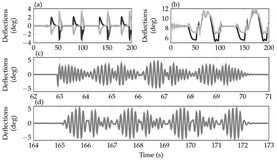 Control surface activity during the simulated flight for the two left and two right ailerons controlling the roll motion in (a), the two left and right ruddervators in (b), and the two ailerons stabilizing the two flutter in (c,d) for the phases when the flutter suppression controller is activated.