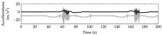 The rigid body motion of this aircraft is described by a standard nonlinear six-degrees-of-freedom flight mechanics model (e.g., [19]) in terms of translational velocities u, v, w and angular velocities p (roll), q (pitch), r (yaw) in the body-fixed frame. Orientation in the earth-fixed reference frame is described in terms of Euler angles (bank), (pitch), and (heading). The angles between body-fixed frame and wind axes are angle of attack and side-slip angle . The flight path is described with respect to earth by the path angle and the course angle . To describe the flutter phenomena, the structural dynamics from a reduced finite element model are coupled with aerodynamics derived via the doublet lattice method. This coupling to derive the aeroelastic model is achieved via splining. For the flexible wing-set the first flutter mode (symmetric), becomes unstable at around 52 m/s with 8 Hz, while the second one (asymmetric) mode, follows at 54.5 m/s with 7.3 Hz [11,20]. A detailed description of the aircraft modeling and its analysis is also provided in [10,21].