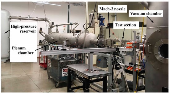 Experiments were carried out in the supersonic blow-down wind tunnel SBR-50 at the University of Notre Dame. An image of the wind tunnel facility is shown in Figure 2. The wind tunnel is composed of a high-pressure reservoir, plenum chamber with an ohmic heater, Mach-2 supersonic nozzle, test section, and a vacuum tank. The plenum chamber pressure can be adjusted by increasing the pressure from the high-pressure reservoir and by heating the air, but the actual stagnation pressure is identified based on the static pressure at the nozzle exit. In the present configuration, Mach-2 supersonic flow is realized at the test section, which has a 76.2 mm × 76.2 mm rectangular cross section at the nozzle exit and a 1° half-angle expansion along the top and bottom walls to compensate the growth of boundary layers. The stagnation temperature can be varied from room temperature up to 800 K. The stagnation pressure can be controlled from 0.1–5 bar as per requirement. The flow duration is 1 s at maximum. In the present work, the stagnation pressure P0 ranged from 1–3 bars and the stagnation temperature T0 varied from 294–600 K. By changing stagnation temperature and pressure, various Reynolds number conditions were achieved, with Reynolds number values ranging from 5.3 × 105 to 3.4 × 106 based on the characteristic distance of 85 mm—measured from the nozzle exit to the leading edge of the compression ramp along the flat test section wall. While the flow at the test section was steady, plasma-assisted flow control was applied for 0.1 s.